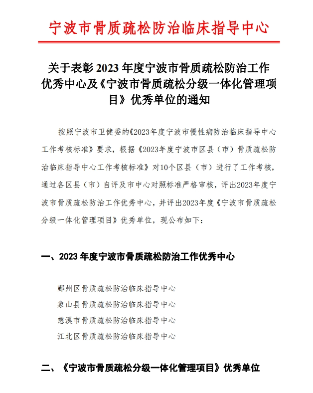 近期宁波市骨质疏松防治临床指导中心发布了关于表彰2023年度宁波市骨质疏松防治工作优秀中心及《宁波市骨质疏松分级一体化管理项目》优秀单位的通知,宁波诚鸿骨科医院榜上有名,被评为《宁波市骨质疏松分级一体化管理项目》优秀单位。